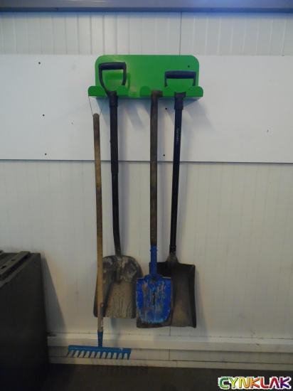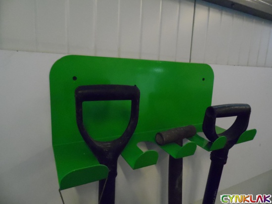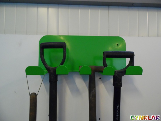 Stalowy wieszak na łopaty grabie i inne narzędzia ogrodnicze.